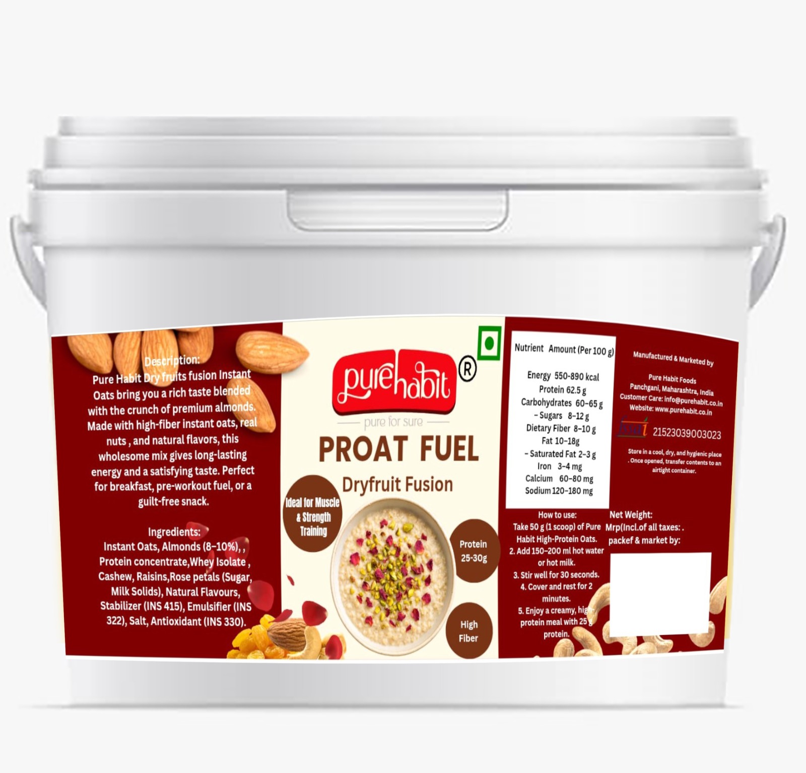 Proat Fuel Dryfruits Fusion by Pure Habit is a power-packed high protein instant oats blend crafted for gym-goers, fitness enthusiasts, and anyone looking for clean daily nutrition. This unique fusion combines premium instant oats with carefully selected dry fruits, delivering sustained energy, muscle support, and great taste in every bite.