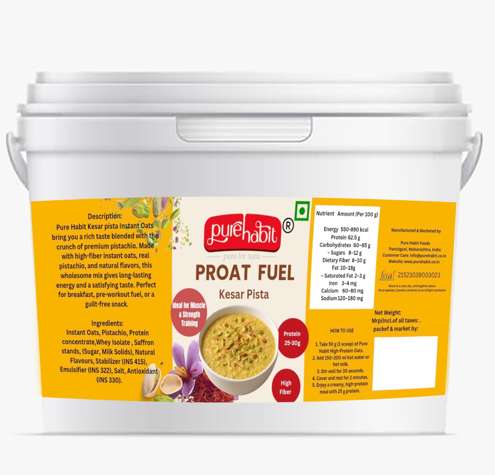 Proat Fuel Kesar Pista Instant Oats is designed for those who enjoy premium flavours along with functional nutrition. Made using quality oats, this blend features aromatic saffron flavour and pistachio for a rich and satisfying taste experience.