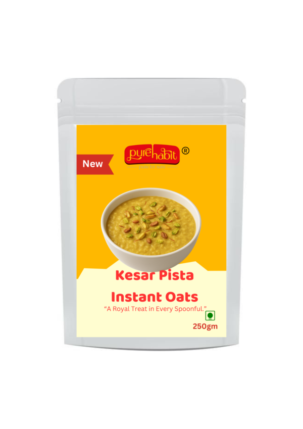 Pure Habit Instant Oats – Kesar Pista combines the richness of real saffron strands, crunchy pistachios, and wholesome oats to give you a delicious, nourishing breakfast in just 3 minutes.